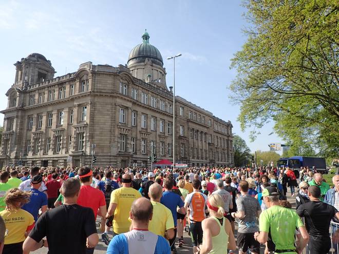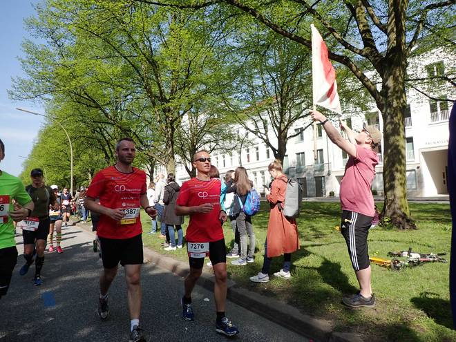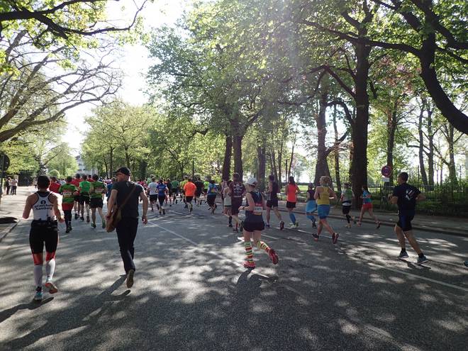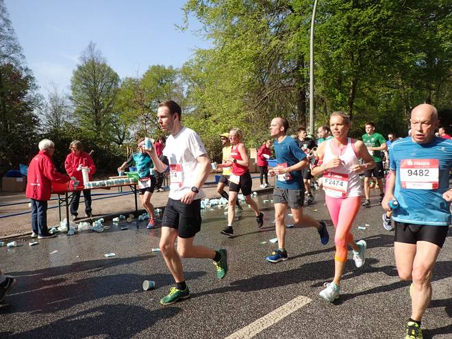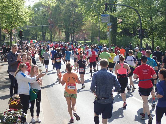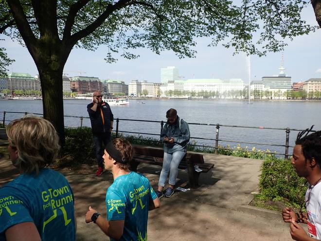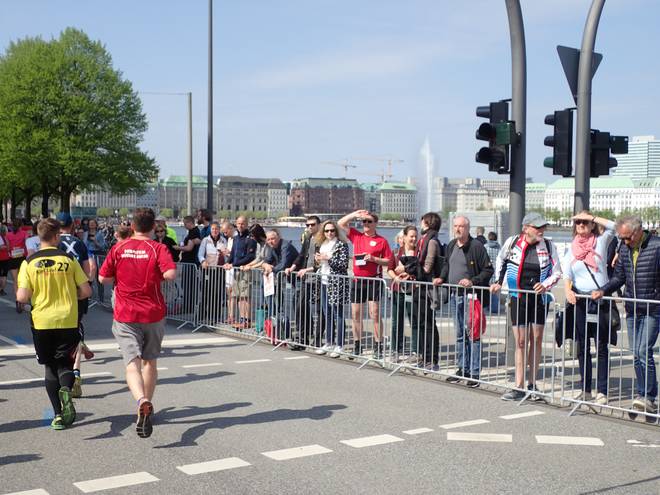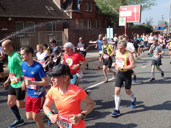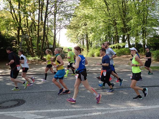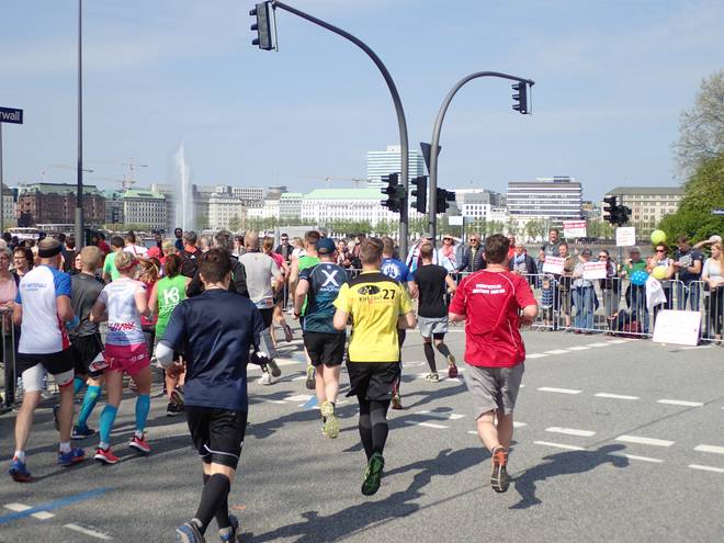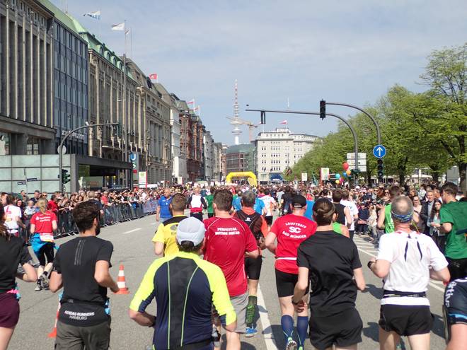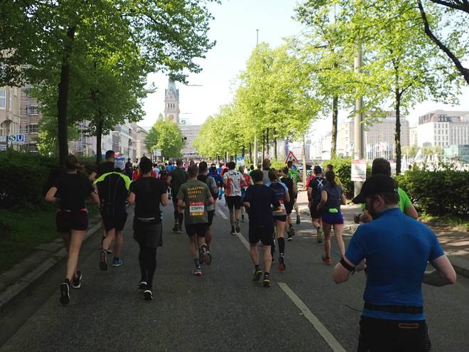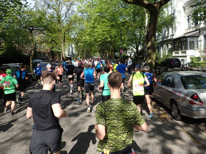 Holstenglacis Glacischaussee 9.39 Uhr / Km 0,5 Im Jahr zuvor hatte es hier noch gehagelt. Da waren wir 2018 doch besser dran. |