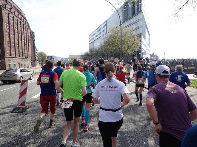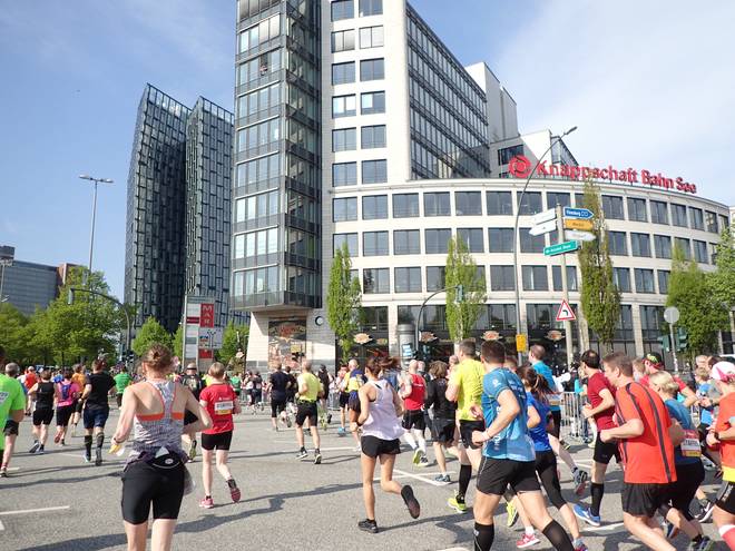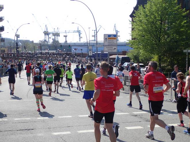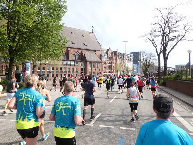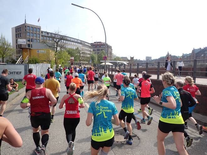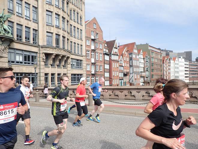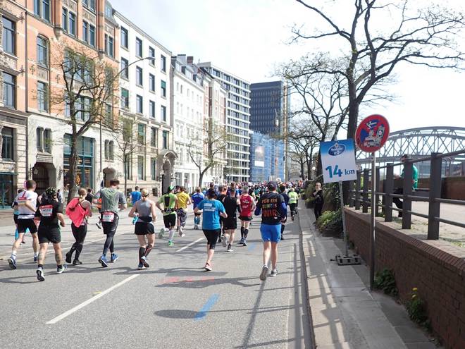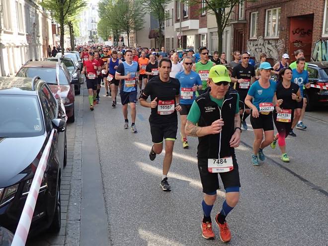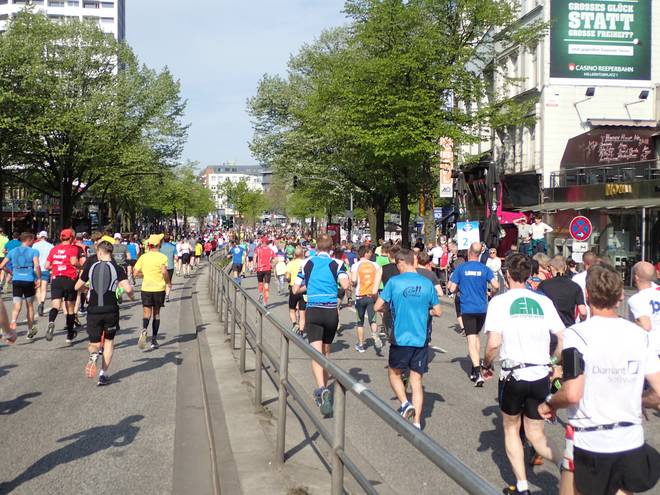 Reeperbahn 9.47 Uhr / Km 2,0 In Wien rannte zunächst alles langsamer als ich und ich kam nicht durch und hier lief alles schneller als ich. Und dabei lief ich hier 20 Sek/Km schneller als in Wien. |
