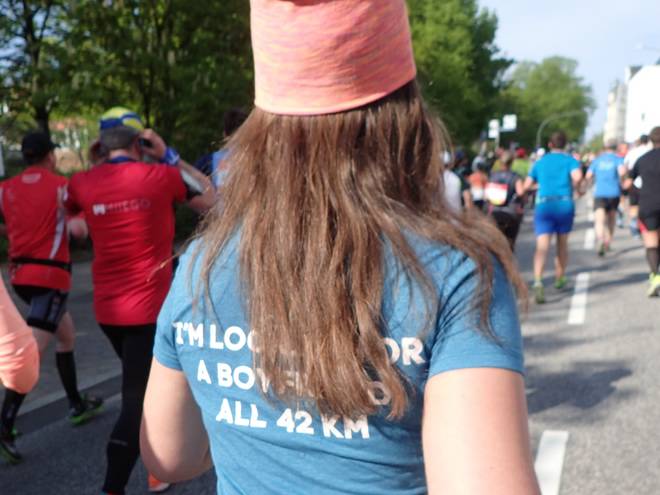 Königstraße 9.51 Uhr / Km 2,7 I'm looking for a boyfriend all 42 Km Ein Marathon als Parship-Ersatz? Alle elf Kilometer verliebt sich ein Läufer? Warum nicht? |