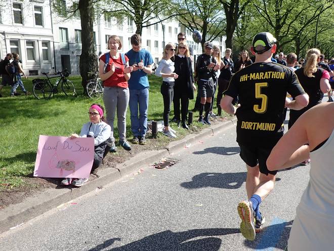 Königstraße 9.52 Uhr / Km 2,9 Wie in den Vorjahren gab es wieder jede Menge Schilder an der Strecke. Allerdings dieses Mal wenige selbst bastelte, dafür viele vorgedruckte. |