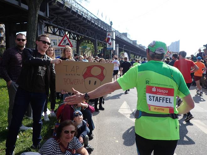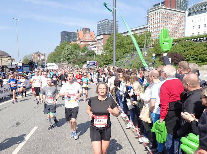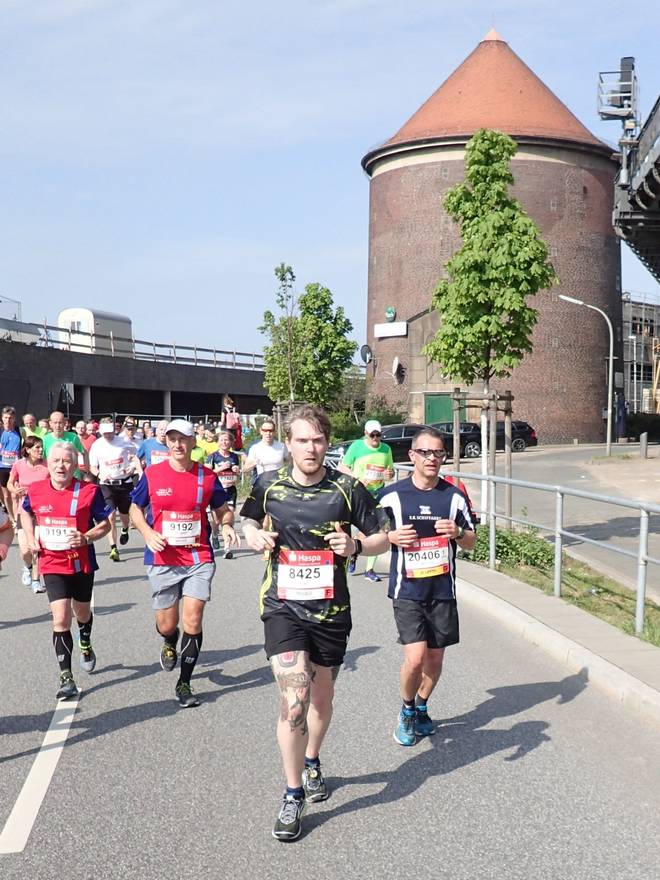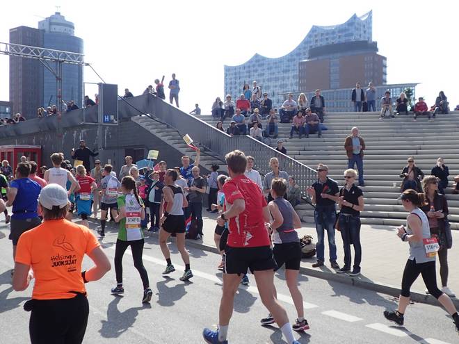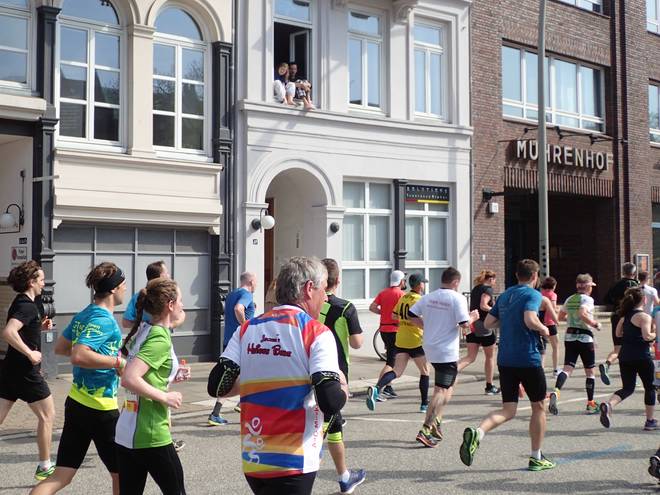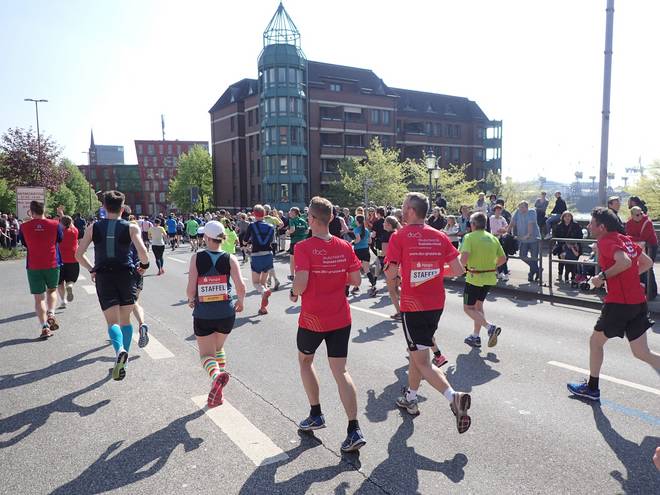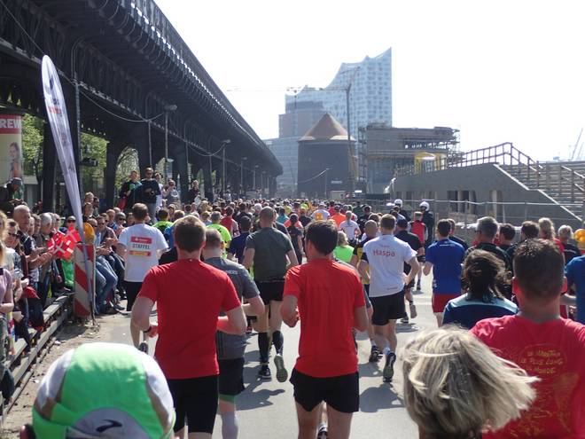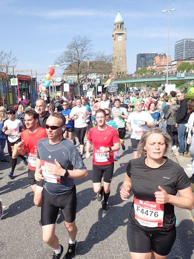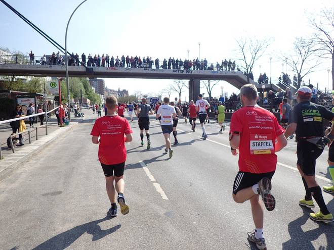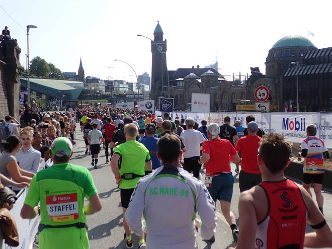 Vorsetzen 10.49 Uhr / Km 12,7 Auch an der U-Bahn Baumwall genossen die Leute den Blick von der Brücke. Wenn das Laufen nicht so viel Spaß machen würde, dann würde ich mir da auch hinstellen und zuschauen. |