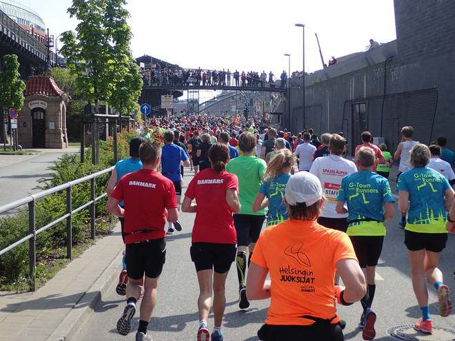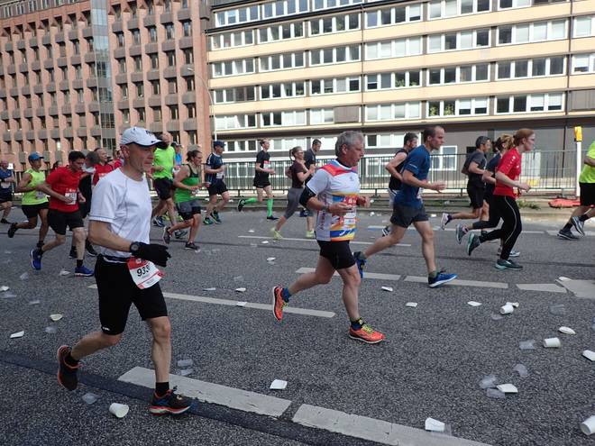 Johannisbollwerk 10.46 Uhr / Km 12,2 Ein wenig eng, aber man kam noch gut durch. Und mit etwas Extra-Power geht alles. Und läuft alles. |