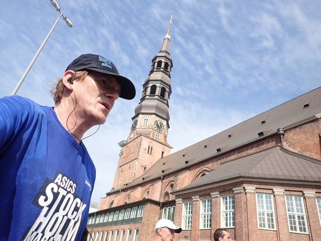 Katharinenkirchhof 10.55 Uhr / Km 13,9 Manchmal klappt es mit dem Selfie mit der Hauptkirche St. Katharinen, manchmal nicht. Dieses Mal klappt es ganz besonders gut. |