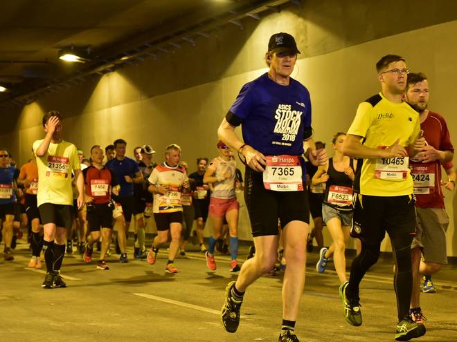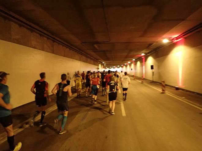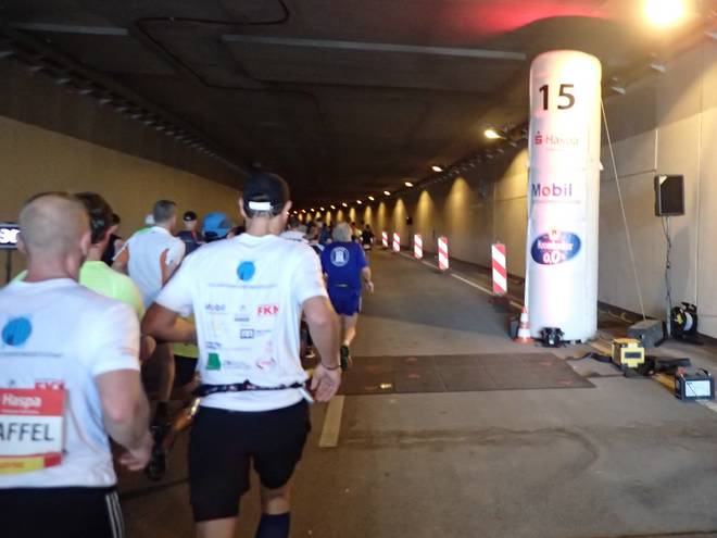 Wallringtunnel 11.04 Uhr / Km 15,4 Und es war auch nicht sehr beruhigend, daß Eingangs des Tunnels ein Läufer kollabiert war und die Sanitäter alles andere als entspannt wirkten. Aber es ging wohl gut aus. das wußte ich da aber nicht. Foto: Marathon-Photos |