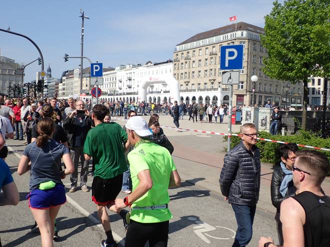 Jungfernstieg 11.09 Uhr / Km 16,3 Für die Startläufer bei den Staffeln war das Rennen hier gleich vorbei, ich hatte noch fast 26 Kilometer vor mir. |