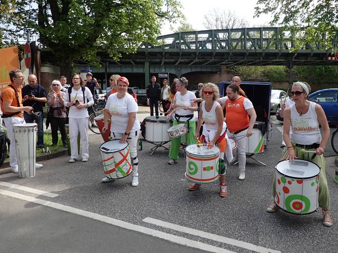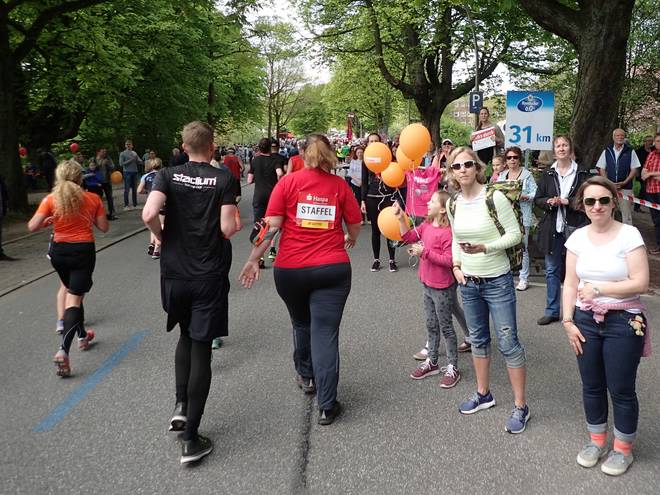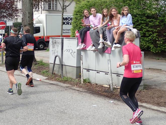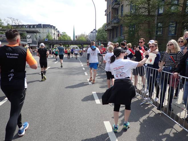 Eppendorfer Baum 13.06 Uhr / Km 37,1 Hier traf ich nicht nur auf viele laute Leute, sondern auch auf die Spenden-Sammler von der Stiftung Phönikks. Das Geld geht an krebskranke Kinder. |