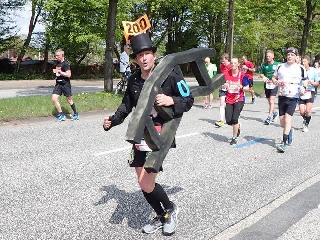 Alsterkrugchaussee 12.48 Uhr / Km 33,7 Im letzten Jahr noch als Elbphilharmonie unterwegs, dieses Mal zum 200. Marathon als Schornsteinfeger: Thorsten Stohldreier. |