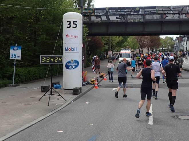 Tarpenbekstraße 12.57 Uhr / Km 35,3 Also... naja... okay... immerhin noch 30 Sekunden Rückstand auf die Planzeit aufgeholt. Der restliche Rückstand: noch 1:21 Minuten. |