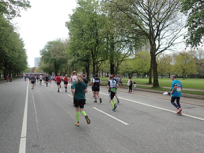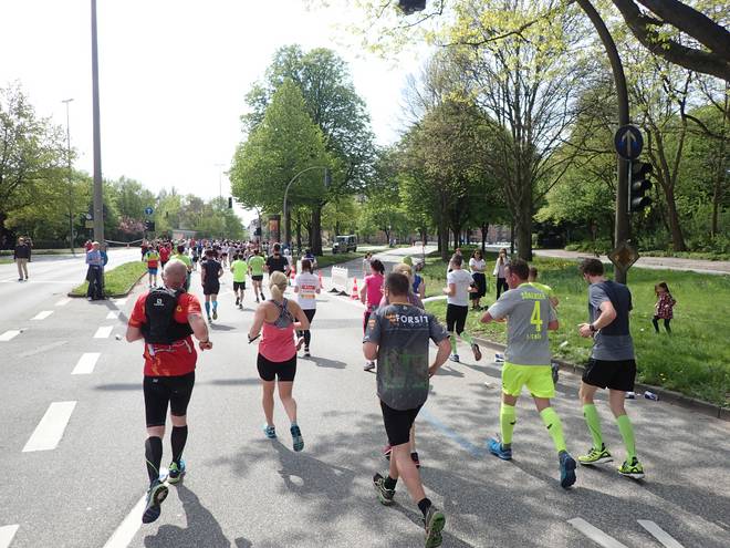 Harvestehuder Weg 13.09 Uhr / Km 37,7 So wie ich nun die Kilometer lief sollte es locker für ein Finish unter vier Stunden reichen. 3:58 Stunden oder so. |