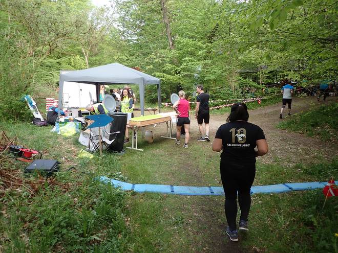 Mønsted Kalkgruber 10.27 Uhr / Km 30,3 Hinter der Menschgruppe machten sich die nächsten Läufer fertig für den Start. |