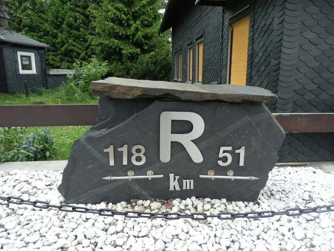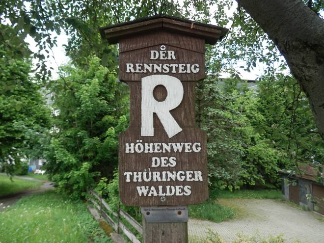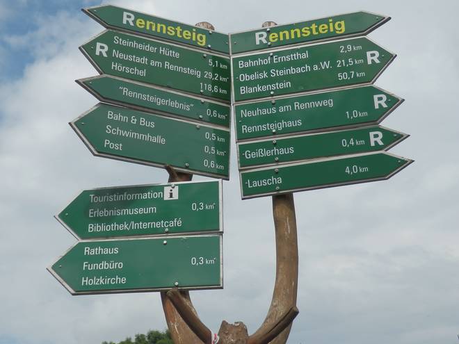 Rennsteigweg 14.57 Uhr 51 Kilometer bis Blankenstein und 118 Kilometer bis nach Hörschel bei Eisenach. Der gesamt Rennsteig ist somit rund 170 Kilometer lang. |