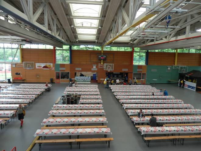 Guts-Muths-Halle 8.16 Uhr Wer wollte, konnte hier schon ab 6.00 Uhr frühstücken. Ich hatte aber doch lieber etwas eigenes dabei. Da gibt es dann weniger Überraschungen. Ich hatte ohnehin mal wieder Magenschmerzen. Aber nach ein paar Dixi-Sitzungen hoffte ich, bis Schmiedefeld durch zu kommen. |
