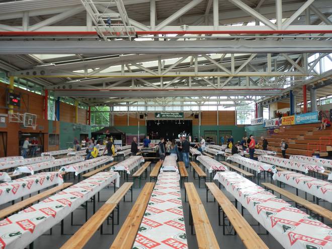 Guts-Muths-Halle 18.03 Uhr Um 18.00 Uhr startete die Heichelheimer Kloßparty. Schon war der Laden voll. |