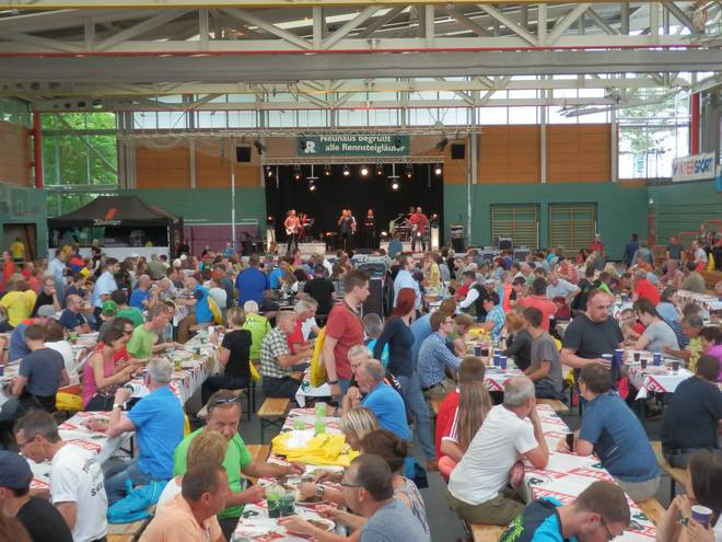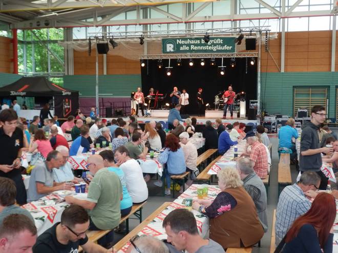 Guts-Muths-Halle 18.16 Uhr Gleich am Anfang wurde das Rennsteig-Lied gespielt. Für Nicht-Schlager-/Volkslieder-Fans außerhalb des Zeit des Rennsteiglaufes unerträglich, aber hier steht gleich alles auf den Bänken und grölt mit. |