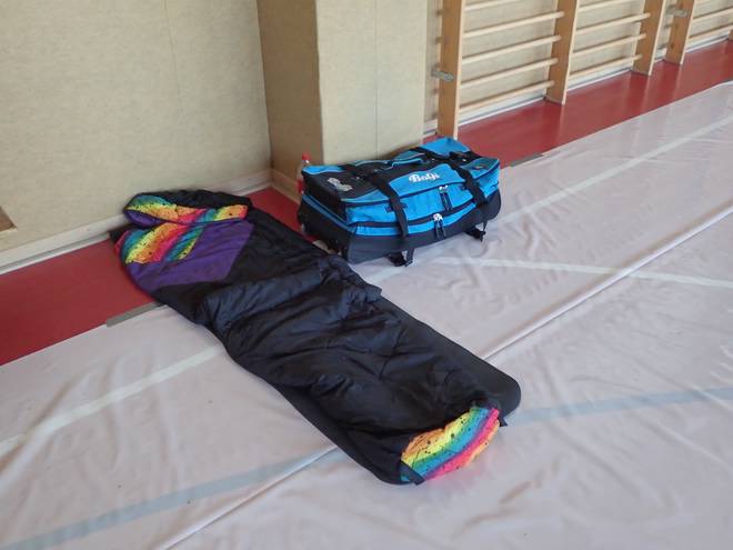 Regelschule Am Apelsberg 15.19 Uhr Am Ende hatte ich den Platz in der Turnhalle gefunden. Die Nacht kostete € 2,00. Es war das erste Mal, daß ich so eine Gemeinschaftsunterkunft in Anspruch nahm. Später würde es hier noch richtig voll werden. |