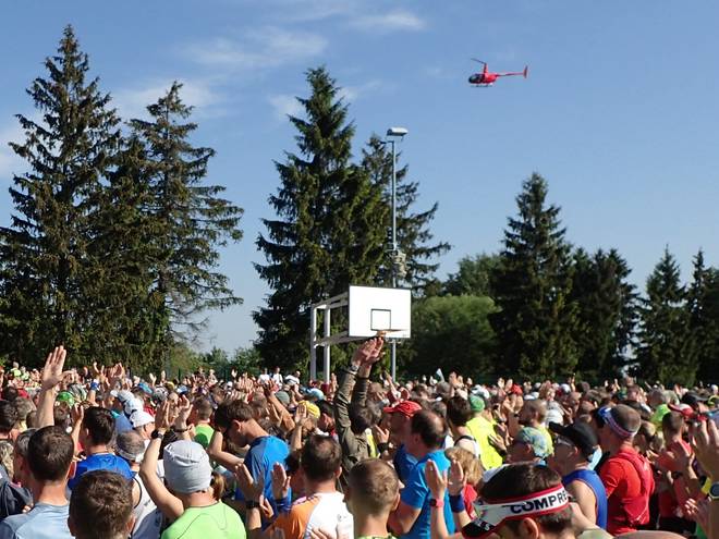 Freisportanlage am Apelsberg 9.00 Uhr Pünktlich dann der Start beim angeblich schönsten Start aller Rennsteiglauf-Starts. Oder war es überhaupt? Egal. Beim Rennsteiglauf wird mit "schönster" allerorts nur so um sich geworfen. Aber das hier war weder "schön" noch in irgendwas "schönster". |
