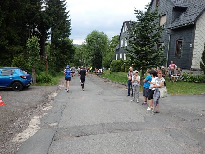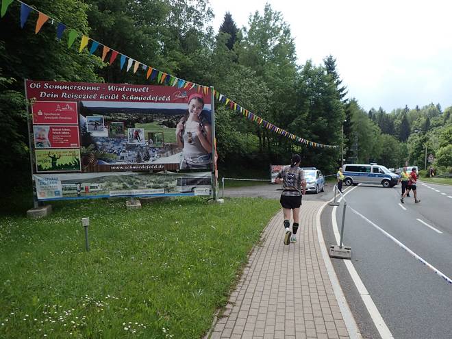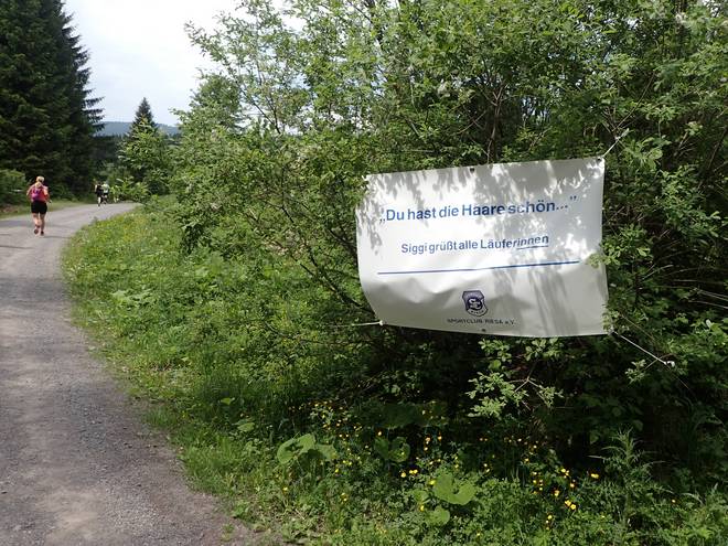 Ruppachstraße Schmiedefeld am Rennsteig 13.41 Uhr / Km 41,2 Wir erreichten den tiefsten Punkt der Strecke. Bei 687 Metern. Somit lagen zwischen dem höchsten und tiefsten Punkt der Strecke nur 154 Meter. Dazwischen pendelt man aber 769 Meter rauf und 844 Meter runter. Macht also 1613 Meter Höhendifferenz. Beim Supermarathon sind es 3260 Meter (1874 Meter rauf, 1386 Meter runter). |