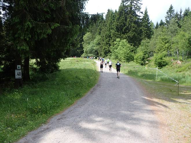 Ilmenauer Straße Schmiedefeld am Rennsteig 13.40 Uhr / Km 40,9 Nun ging es erst noch eine Weile bergab. |