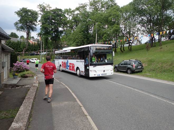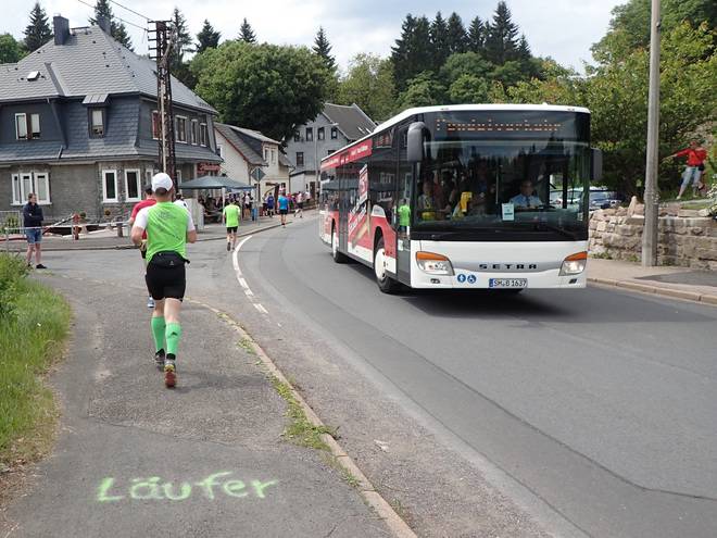Schleusinger Straße Schmiedefeld am Rennsteig 13.40 Uhr / Km 41,0 Auf dem Weg durch den Ort kamen uns die Pendelbusse entgegen, die die Läufer an die Startorte zurückbrachten. |