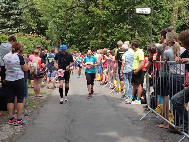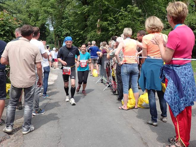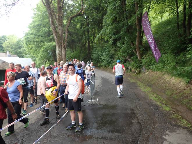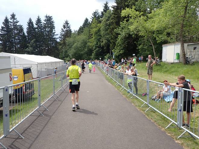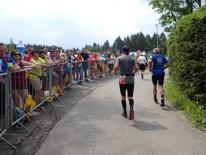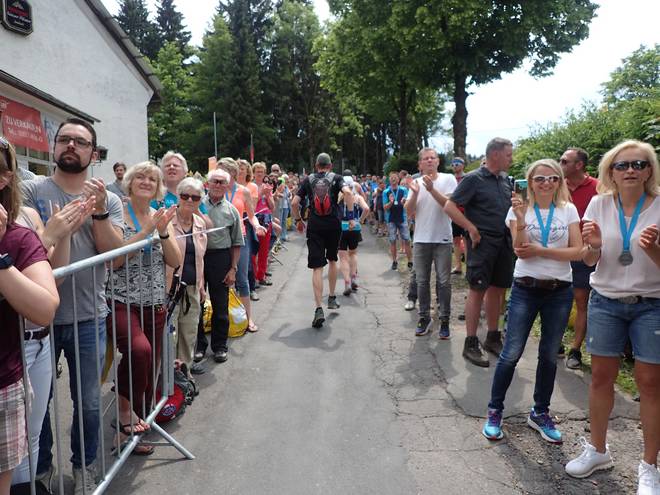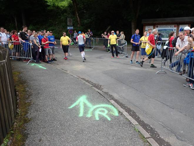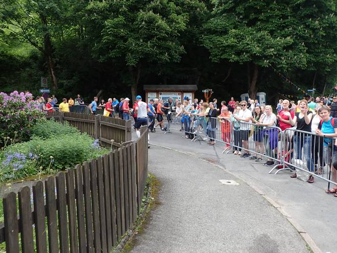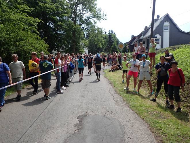Ruppachstraße Schmiedefeld am Rennsteig 13.44 Uhr / Km 41,7 Die Hälfte der Zuschauer hier waren Finisher. Die rechte Seite war auch deshalb so voll, weil dort der Weg runter zu den Pendelbussen war. |