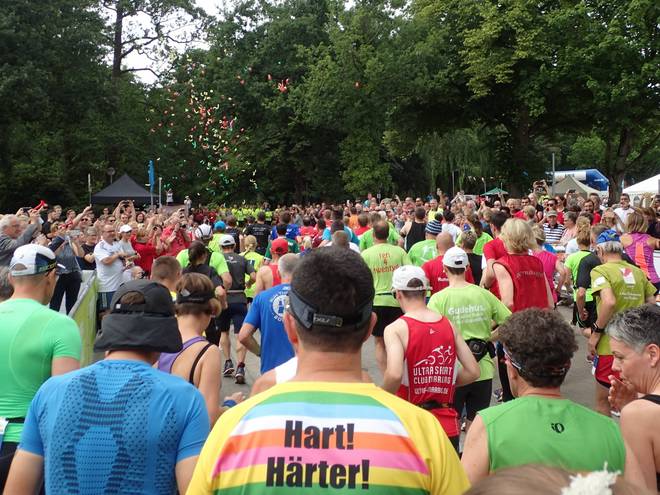 Runde 1 (1,205 Km) 12.00 Uhr Der Start mit Konfetti-Regen. Mein erster 24-Stunden-Lauf hatte begonnen. |