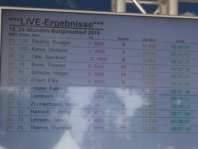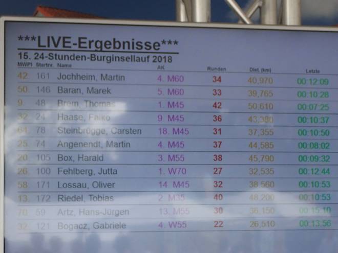 Runde 36 (43,391 Km) 17.19 Uhr Und hier die Bestätigung. 36 Runden. Das wäre geschafft. Und trotz des vielen Wanderns immer noch Platz 9 in meiner Altersklasse. Erstaunlich. |