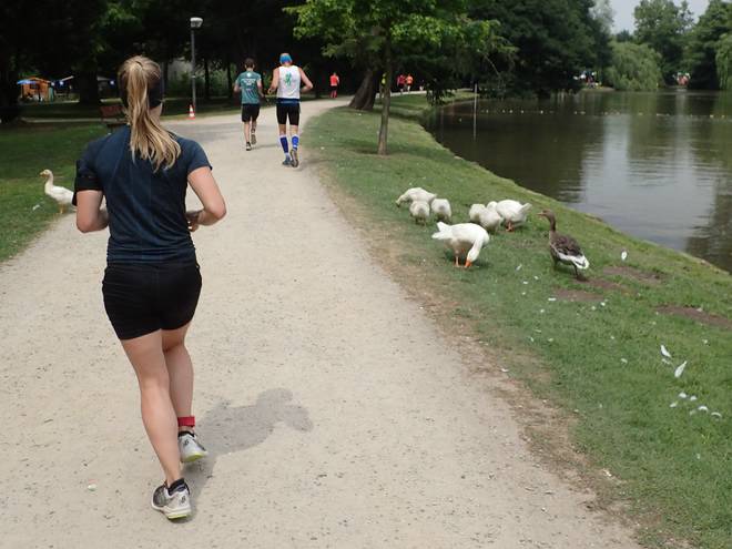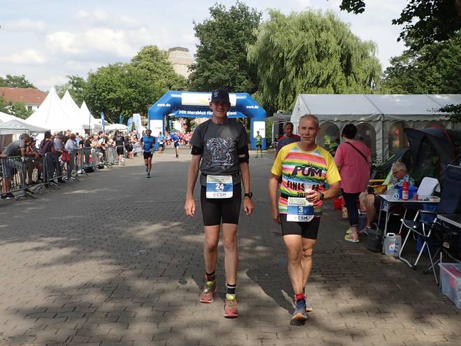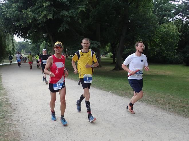 Runde 22 (26,517 Km) 14.57 Uhr Als wenn es (bei allem Respekt für die Staffel-Läufer) nicht schon nervig genug war, daß die ganze Zeit Läufer mit der doppelten Geschwindigkeit an mir vorbei zogen. Mal links, mal rechts, mal zu Dritt. Immer fair und mit Abstand, aber da kamen jede Runde viele Überrundungen bei raus. |