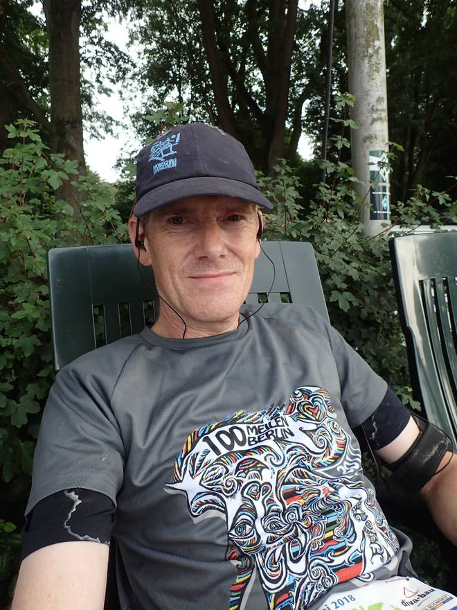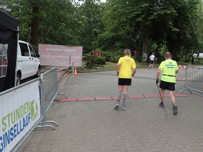 Runde 3 (3,616 Km) 12.18 Uhr Auf ein Kilometerziel wollte ich mich nicht festlegen. 2017 war ich beim Mauerlauf in Berlin 161,7 Kilometer in 22:55:55 Stunden gelaufen. Die letzten 26 Kilometer mit quälender Blase unterm Fuß. Das würde ich mir hier nicht antun. |