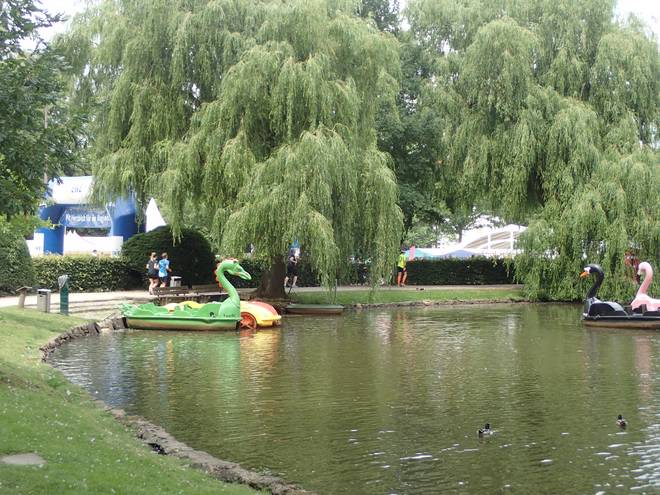 Runde 18 (21,700 Km) 14.24 Uhr Es war auch nicht hilfreich, daß es mit 26°C nicht nur ziemlich warm, sondern auch noch recht schwül war. Ich trank in jeder zweiten Runde einen Becher. |