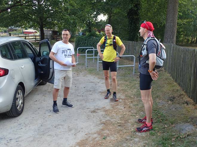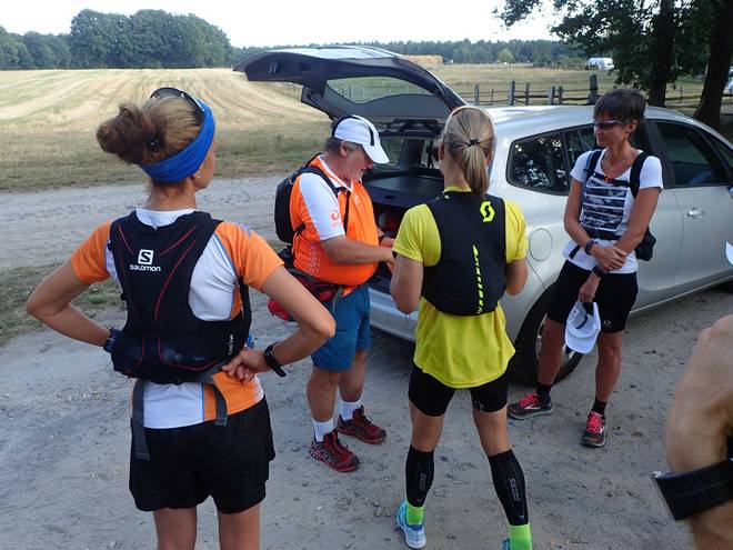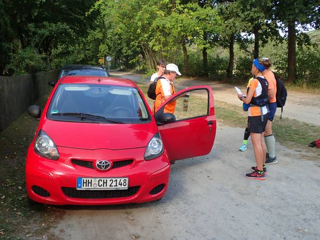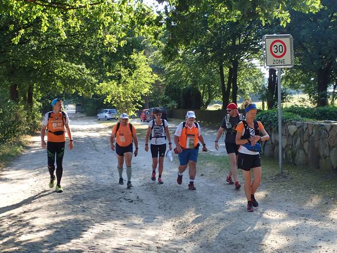 Undeloh Heimbucher Straße 9.09 Uhr / Km 0,1 Nachdem sich auf der ersten Etappe einige Läufer zum Teil massiv verliefen und auch die Verpflegungspunke nicht fanden, wollten sie auf der zweiten Etappe lieber auf Nummer sicher gehen und mit Christian wandern. |