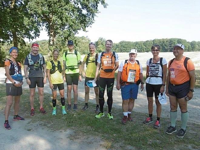 Undeloh Heimbucher Straße 9.02 Uhr Am Start wieder neun Läufer. Aber neue Zusammensetzung. Jutta und Benjamin, die am Vortag noch dabei waren und eigentlich alle drei Tage dabei sein wollten, waren nicht mehr dabei. Dafür gab es mit Martin und Kai zwei Tagesstarter. (Foto: Christian) |