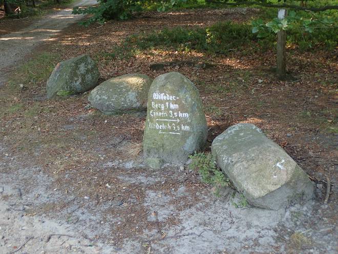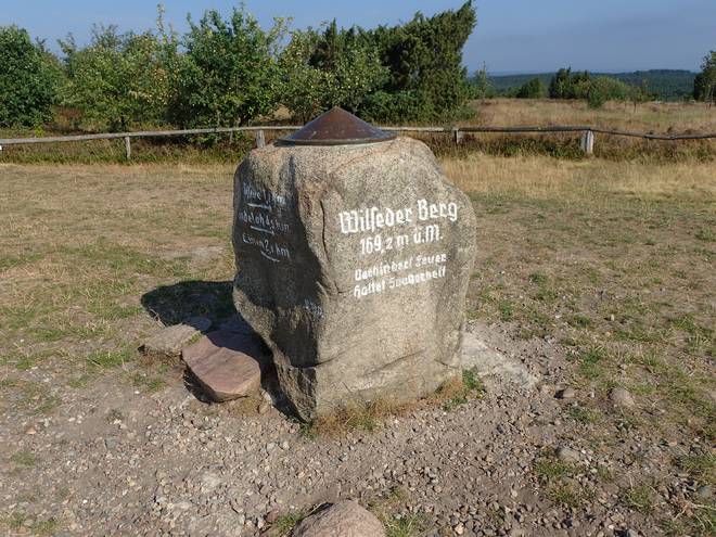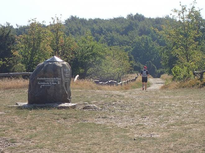 Wilseder Berg 9.43 Uhr / Km 4 Der Stein markiert den Gipfel. Diesen Hinweis braucht man auch, denn auf dem relativ flachen Plateau würde man den höchsten Punkt sonst niemals finden. Kai hatte schon seine Fotos gemacht und stürmte weiter. |