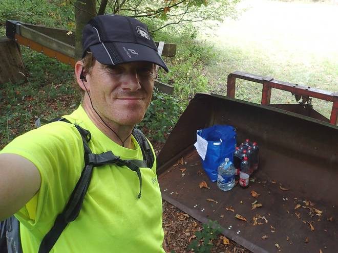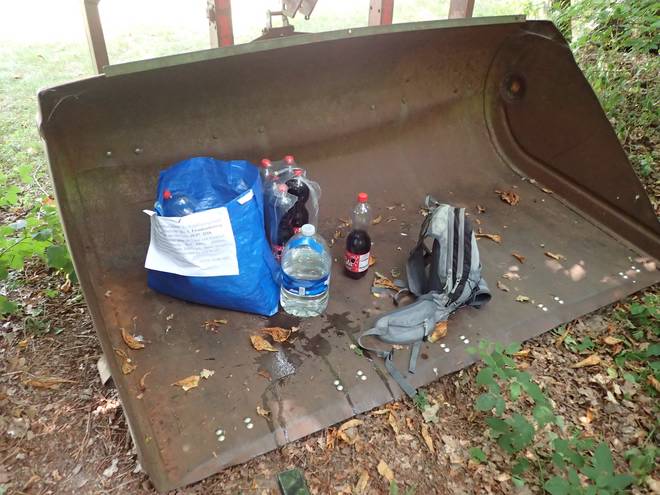Hof Möhr 13.07 Uhr / Km 27,9 Erstmals wurde erst getrunken und erst dann fotografiert. Da war die Cola-Flasche schon halb leer. Vor mir war noch keiner an der Flasche dran gewesen. |