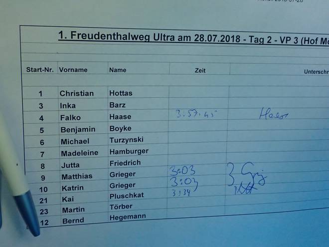 Hof Möhr 13.07 Uhr / Km 27,9 Katrin und Matthias rannten weiter vorne weg, hatten nun fast 55 Minuten Vorsprung. Kai lag nun 24 Minuten vor mir, hatte weitere vier Minuten gewonnen. |