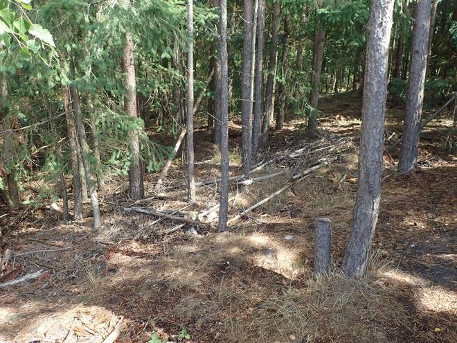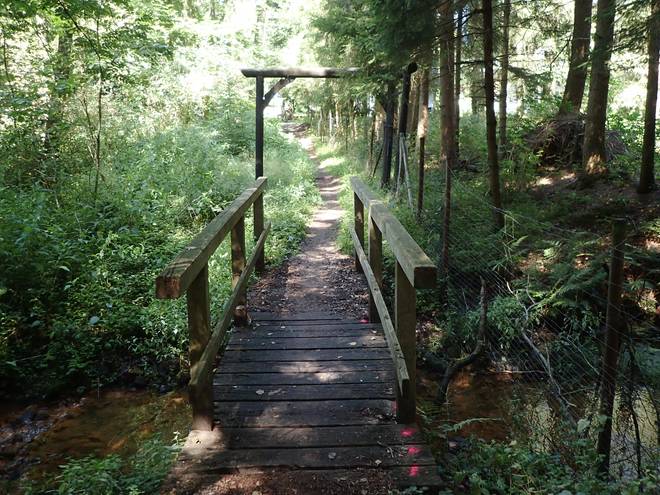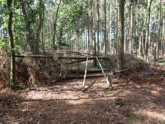 11.09 Uhr / Km 14 Das war wieder der richtige Weg, aber der war versperrt. Ob die beiden Stämme vorne zum drüber Balancieren waren? Ich lief herum. |