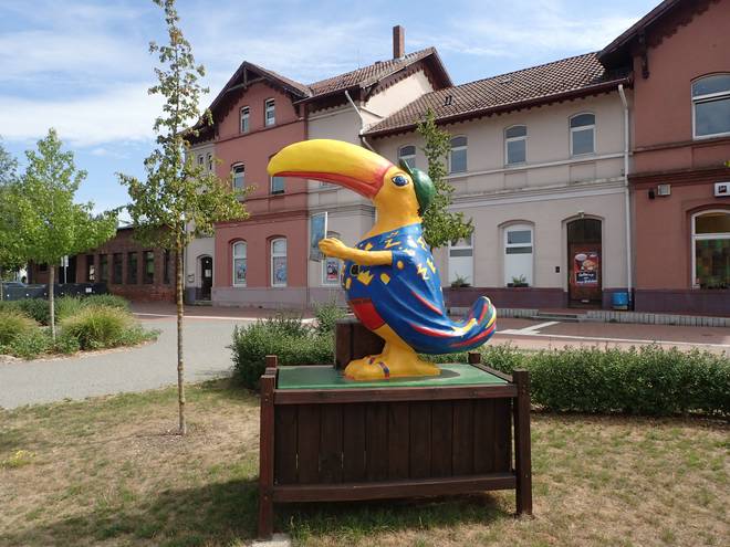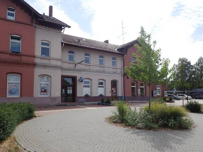 Walsrode Bahnhof Walsrode 11.37 Uhr / Km 17 Kurz überlegte ich, mir im Bahnhof etwas zu trinken zu kaufen, aber ich hatte ja noch genug und so sehr weit war der nächste Verpflegungsstand nicht mehr. |
