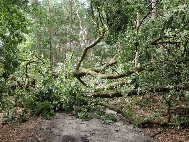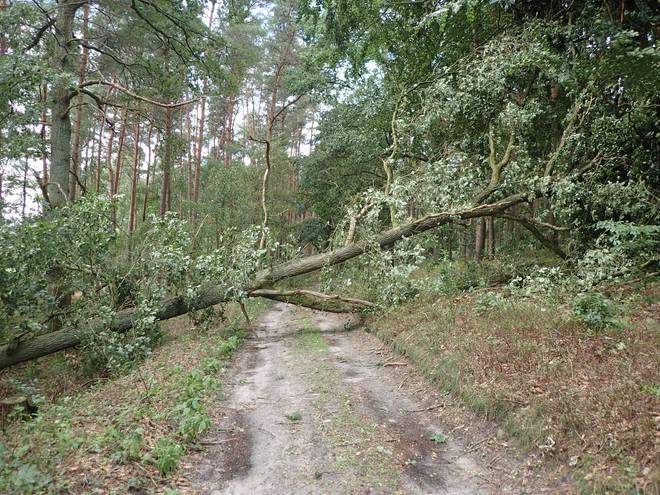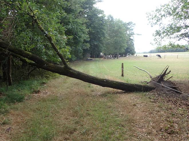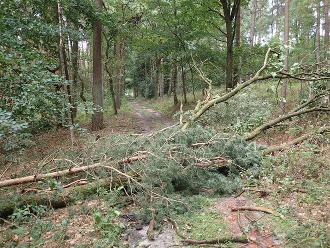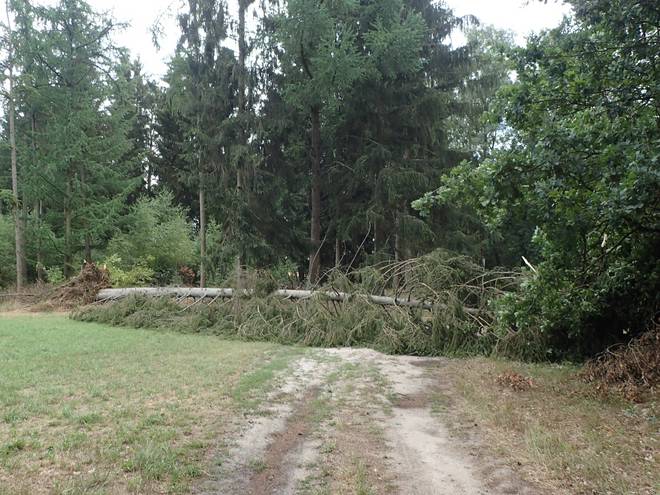 13.58 Uhr / Km 32 Nun kam ich zu den negativen Folge des Sturmes. Auf recht kurzer Strecke waren gleich mehrere Bäume umgestürzt. Das Problem sah gewaltig aus, man konnte aber außen herum wandern. |