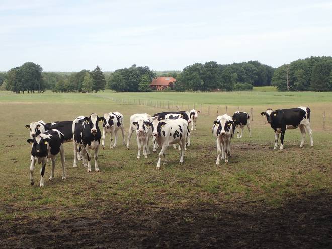 Neuenförde 14.50 Uhr / Km 38 Oh oh... neugierige Kühe. Die waren zwar alle hinter einem Zaun, aber würde die Tiere kaum aufhalten können. Also schnell weiter. |