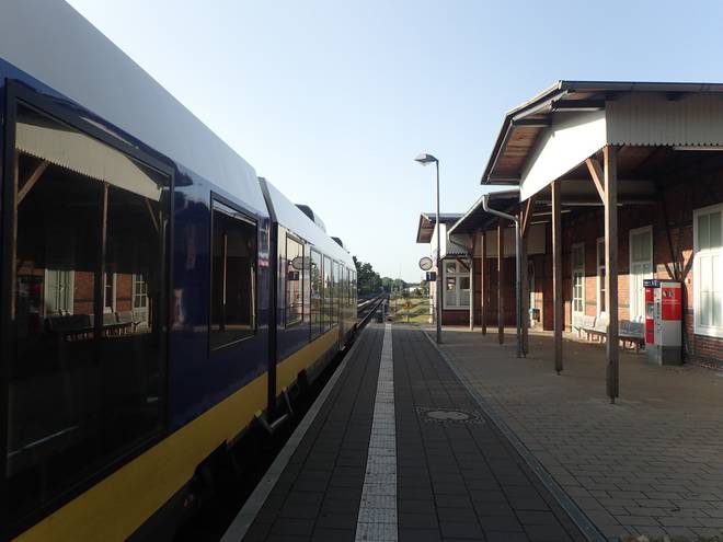 Bahnhof Schneverdingen 8.42 Uhr Um 5.30 Uhr hieß es für mich aufstehen, damit ich um 10 Uhr am Start des 56 Kilometer entfernten Schneverdingen stehen konnte. Aber immerhin schaffte ich es rechtzeitig. In der Lüneburger Heide gibt es reichlich Orte, die man vor Mittags gar nicht erreichen kann. |