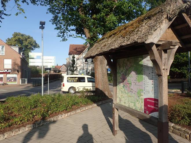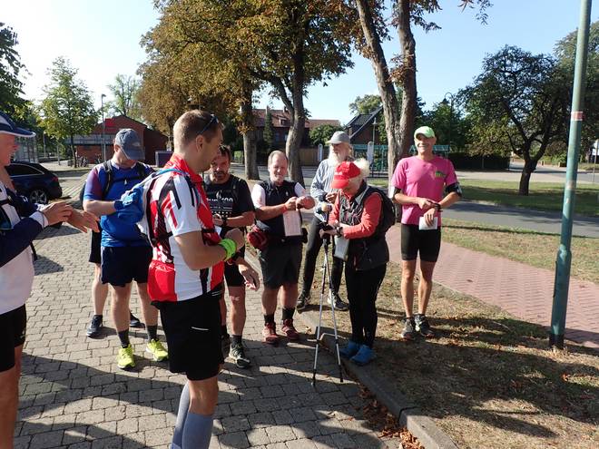 Niederhaverbeck 11.20 Uhr / Km 10,6 Ich hätte vielleicht die Tafel anschauen sollen und nicht direkt auf Manfred und seinen Wagen zu steuern sollen. Ich trank etwas Cola und füllte meine Trinkflasche wieder auf. Dann konnte es weiter gehen. |