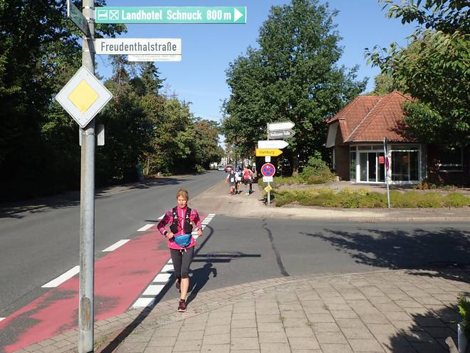 Heberer Straße Schneverdingen 10.07 Uhr / Km 0,3 Hier Madeleine und kurz danach auch Markus setzten sich dann aber auch ab und liefen zunächst in meiner Nähe mit. Freudenthalstraße? Erinnerte mich doch an den dreitägigen Freudenthalweg-Ultramarathon Ende Juli. Da war allerdings jede Etappe länger als hier das ganze Event. |
