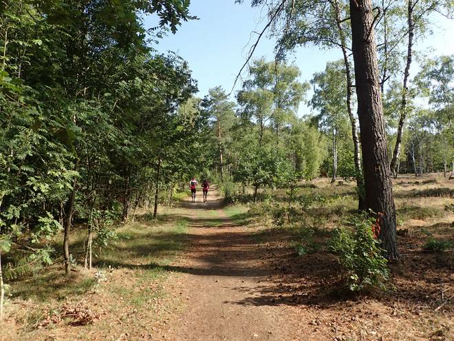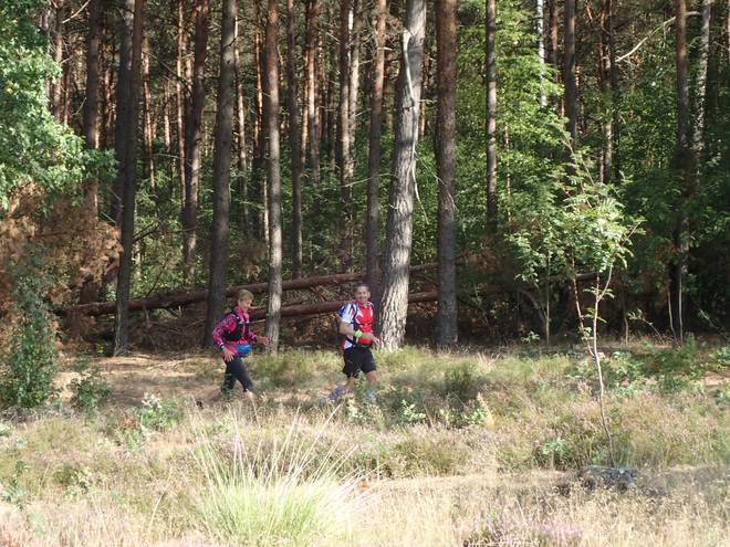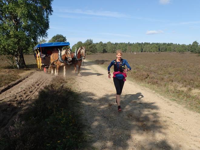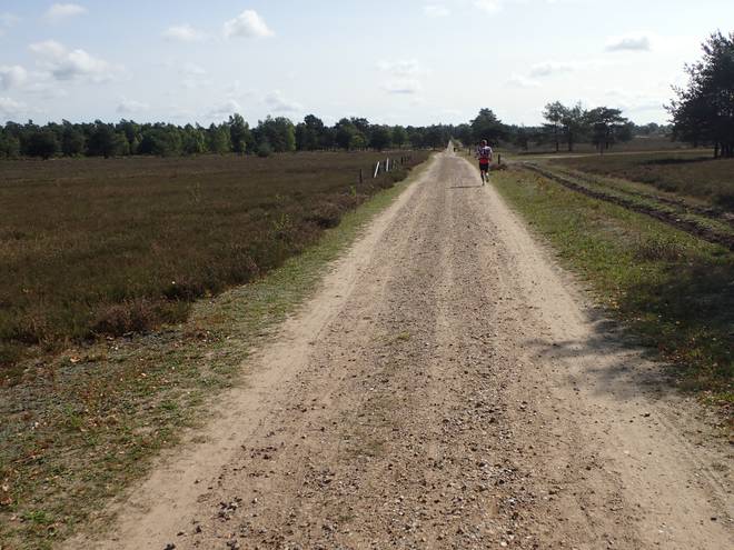 10.25 Uhr / Km 2,8 Wegen der furchtbaren Hitze fiel die Heideblüte dieses Jahr ziemlich mau aus. So leicht lila schimmerte sie schon, aber da brauchte man schon einen direkten Vergleich mit der Heide von vier Woche zuvor. |