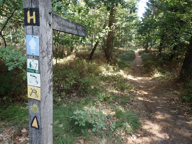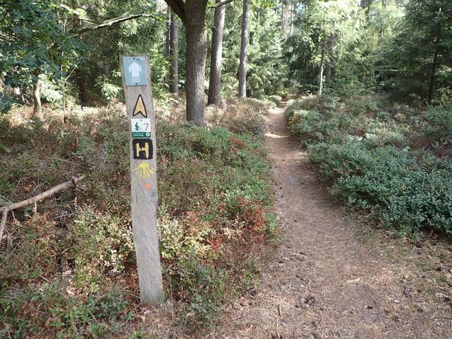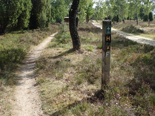 Waldweg 10.13 Uhr / Km 1,1 Der Lila-Krönung-Weg hat kein eigenes Symbol. Das H steht für Heidschnuckenweg, das Zeichen unten ist für den Jakobsweg. Das Zeichen oben markiert lediglich, daß es sich um einen Wanderweg handelt. |