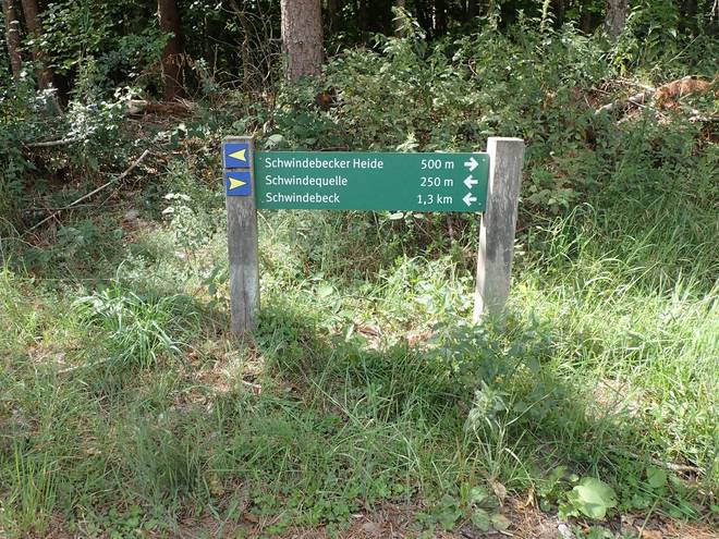 Schwindebecker Heide 13.57 Uhr / Km 29,9 Dabei orientierte ich mich primär nur nach den Pfeilen. Gerade die deutlichen blauen Pfeile des Heide-Panorama-Weges, der hier identisch mit der Lila Krönung war, war eindeutig. |