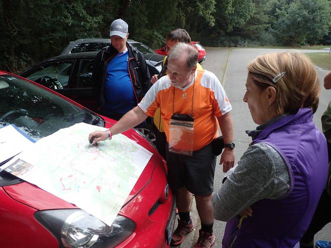 Parkplatz Kronsbergheide 9.47 Uhr Vor uns lag ein komplizierter Kurs. Drei Wanderwege waren abzulaufen. Plus die Wege von Weg zu Weg. Nebenbei mußte man noch 15 Stempelstellen und zusätzlich sechs Kontrollpunkte finden. |