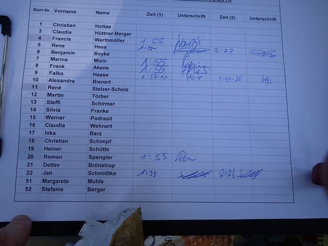 Schwindequelle 12.48 Uhr / Km 22,9 Man trug sich auch zweimal in dieselbe Kontrol-Liste ein. Und wie ich sah, hatte ich die Runde genauso schnell geschafft wie das Führungsduo. |