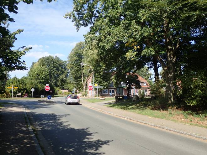 Mühlenstraße (K 9) Soderstorf 13.14 Uhr / Km 26,9 Hier an der Kreuzung hatte ich um 11.32 Uhr die Runde auf dem Heide-Panorama-Weg gestartet. Die war geschafft. Nun ging es weiter auf der Lila Krönung zurück in Richtung Amelinghausen wieder zum Königinnen-Weg. |
