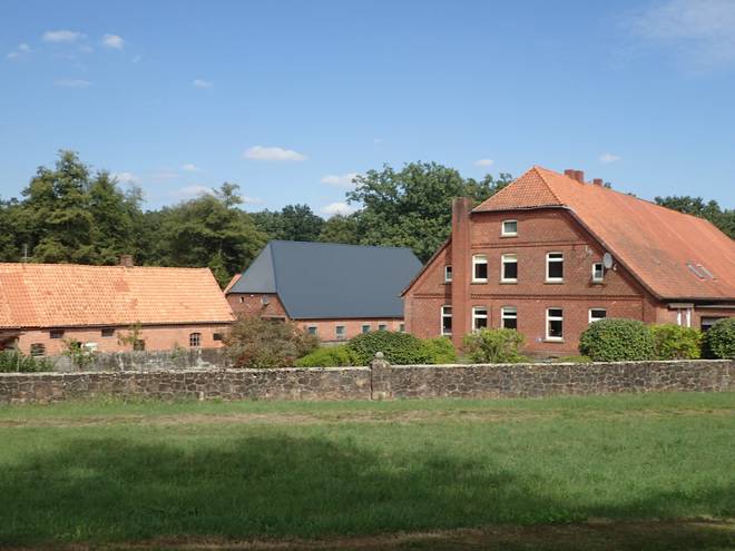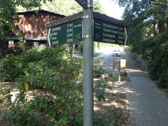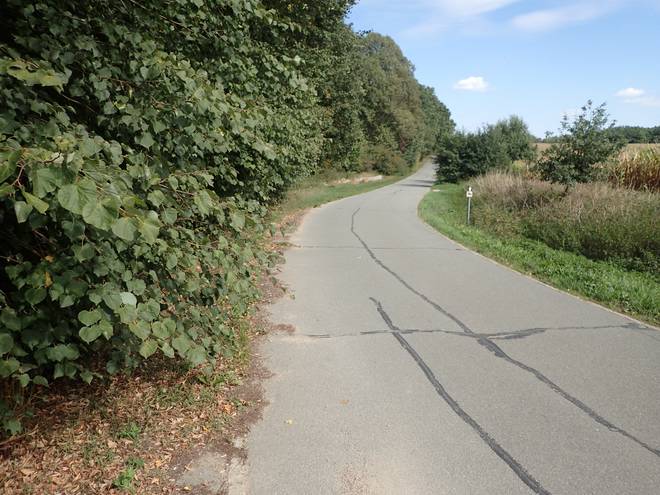 Wohlenbütteler Straße 13.46 Uhr / Km 31,6 Schließlich erreichte ich wieder die Ecke, an der Lila Krönung und der Königinnen-Weg zusammen treffen. Ab hier würde ich nun wieder den roten Pfeilen folgen. |