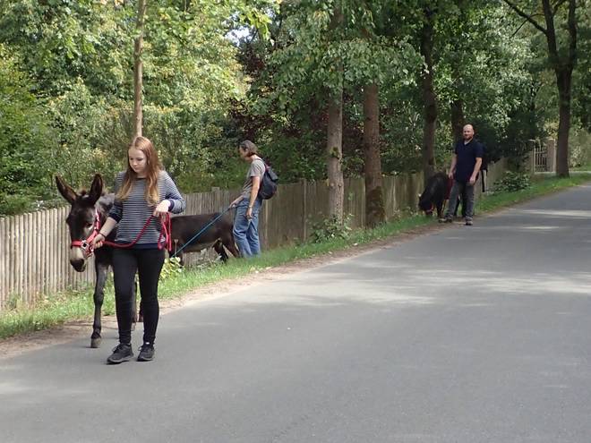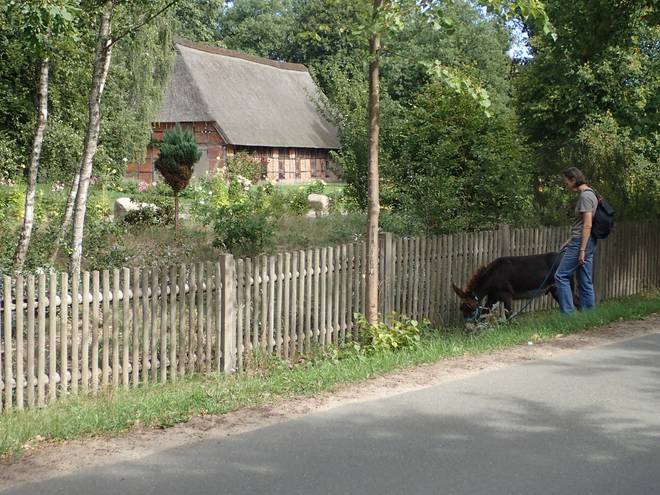 Wohlenbütteler Straße Wohlenbüttel 13.44 Uhr / Km 31,3 Eine skurrile Situation. Hier wurde ich doch tatsächlich gebeten, NICHT zu laufen. Laufen Leute würden die Esel irritieren. |