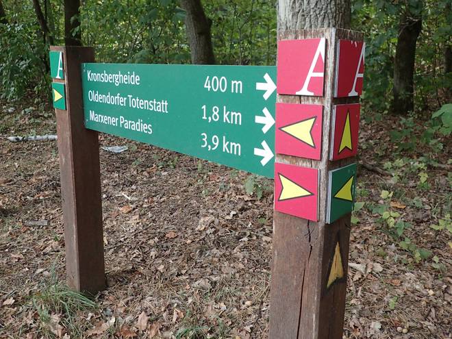 13.57 Uhr / Km 33,2 Hier traf ich nun auf die grünen Pfeile des Sagenhaften Hünen-Weges, den es noch komplett abzulaufen galt. |
